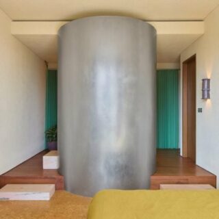 🏠 Dawid Konieczny redesigned a 55-square-meter Warsaw apartment, originally built in the 1950s by Jerzy Gieysztor and Jerzy Kumelowski. Located in Warsaw's Praga district, the apartment features Alpi veneer and honey-colored oak parquet. Konieczny reconfigured the spaces, including a new west-facing bedroom and an open-plan living area. Crafted details include a custom California Burr veneer shelving unit, angular dining chairs, and a low-slung bed frame. The bathroom features gridded tiles with a crimson-red sink.