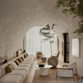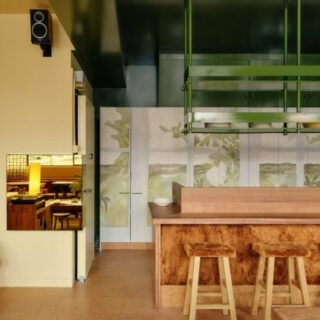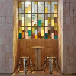 This article was written by Deezen - Interior Design. Click here to read the original article Stained glass windows and custom wooden shutters filter light inside Six Coffee Wine, a…